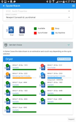 The SpyderWash Mobile App gives users the ability to manage their loyalty card. From the App, users can view their loyalty card balance and transaction history. Users can also recharge their loyalty card directly from the App as well as view which Washers/Dryers are available in the laundry.