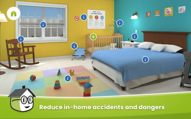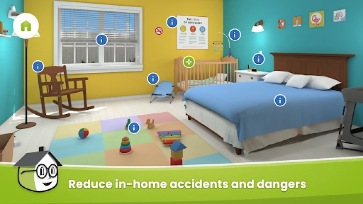 - 5 Interactive Home Spaces: Explore virtual rooms (nursery/bedroom, kitchen, bathroom/laundry, living room, outdoor/garage) to discover safety concerns and mitigation strategies.