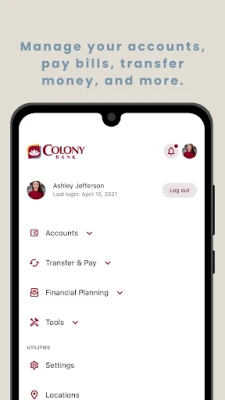 Login to the Colony Bank Mobile App and you can undertake a full range of banking activities conveniently and securely, including the following: