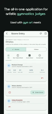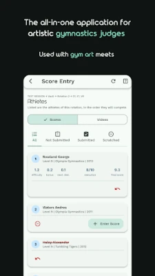 Judges With JC you can submit your execution and difficulty scores for routine performances super easily. The head judge can then review and submit the final score. If ever there’s a mistake, you can easily reverse any score that’s been submitted, as well as scratch (remove) an athlete in the competition.
