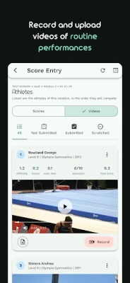 Record Videos You can also easily record and upload routine videos using JC. After logging in the your access code and meet password you’ll see which sessions and rotations you’ve been assigned to. From there you can select the athlete you want to record for, take a video and upload it!