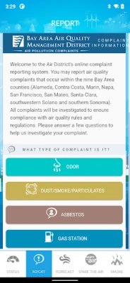 Features •Air Alerts – Provides Alert notifications when the Bay Area is experiencing a Spare the Air Day. •Local Air Reports – Provides 5-day air quality forecasts for each of the nine Bay Area counties. •Report a Smoking Vehicle – Makes 1-800-EXHAUST smoking vehicle reports even easier by allowing users to simply text in the license plates of smoking vehicles. •Bike Route Planner – An active way to spare the air, this tool provides bike route directions and maps. •Air Quality Podcasts – Contains health and air quality podcasts from the Air District and partners such as Breathe California.